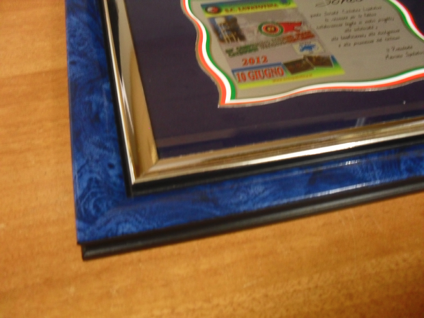 Cornici in legno di ogni genere, dimensione, colore, orizzontale e verticale con la possibilità di inserimento targhe di ogni tipo e dimensione....Le targhe possono essere incise o stampate con loghi, disegni, foto e senza alcuna spesa di impianto serigrafico...seguiamo attentamente la fase realizzativa fornendo al cliente l'impaginazione di come verrà effettuata la targa e naturalmente dopo aver fatto le modifiche richieste verrà completata e confezionata pronta per essere consegnata... I tempi realizzativi sono molto stretti inquanto facendo direttamente tutto noi dobbiamo solo pensare ad accordarci con il cliente stesso...Vogliamo precisare che queste foto sono relative ad una piccola parte della nostra esposizione e che tutte le cornici e targhe sono assolutamente modificabili